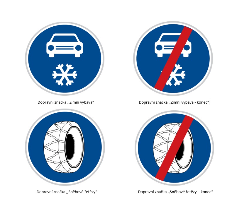 Takto vypadá dopravní značka Povinná zimní výbava (vlevo začátek, vpravo konec platnosti značení)